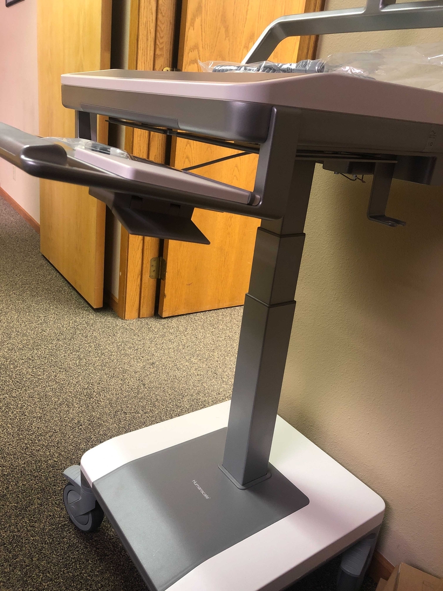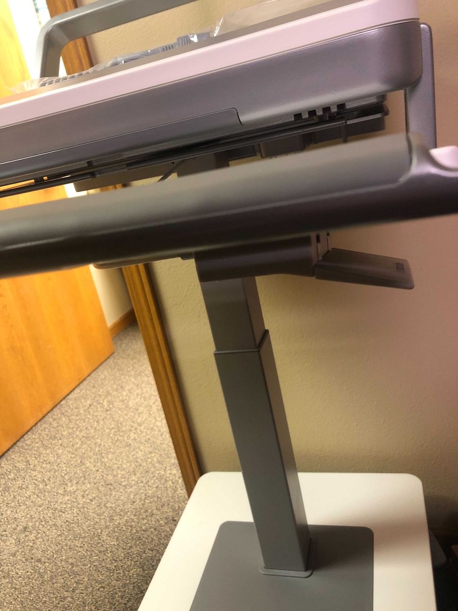 Lift the lever up and the kiosk tray will begin to elevate. Release the lever when the kiosk is at your desired height.