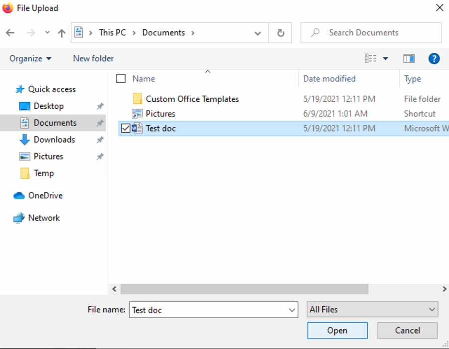 When the document selector pop-up appears, select the "Documents" folder and then your file. Then click "Open"