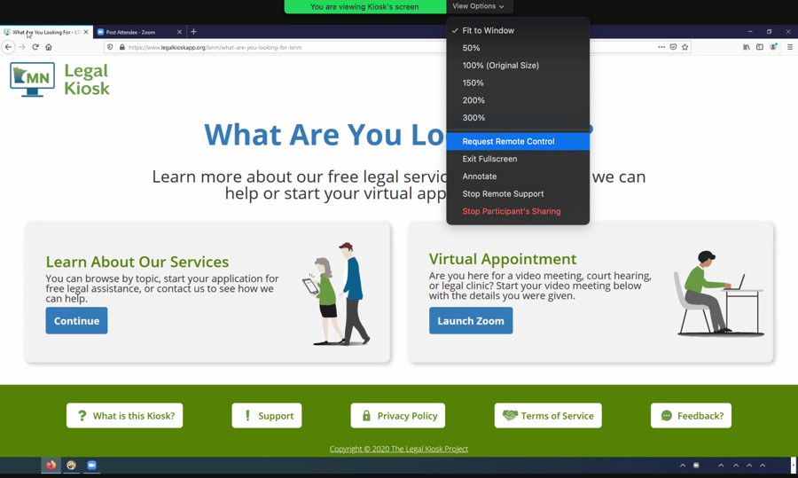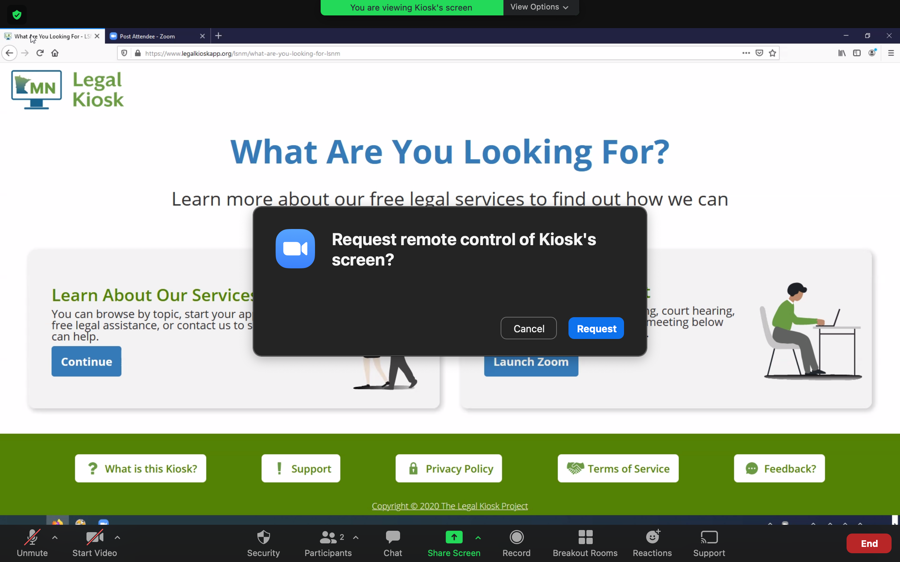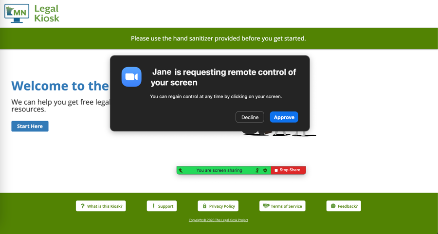 The user at the kiosk should now see a pop-up on their end that says a participant "is requesting remote control of your screen."