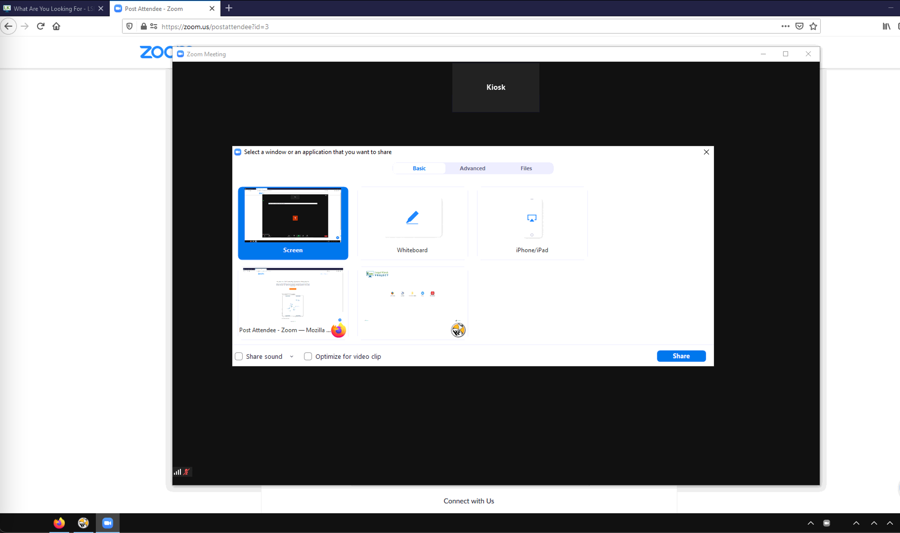 They will be asked what you'd like to share. Have them click on the first option "Screen" highlighted in blue. Then click Share.